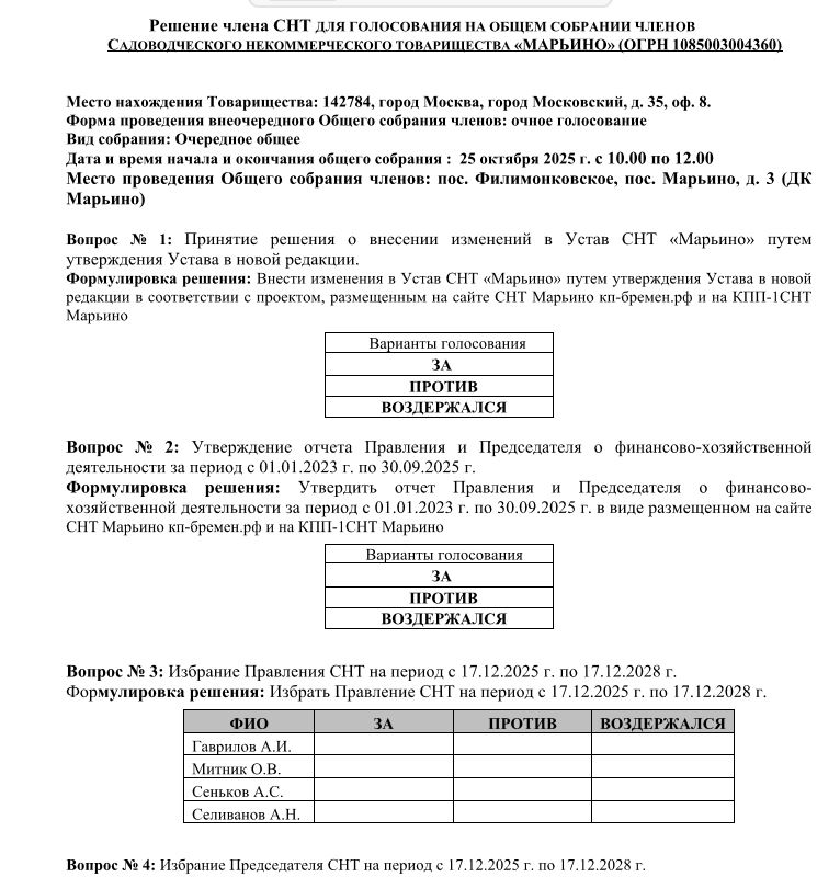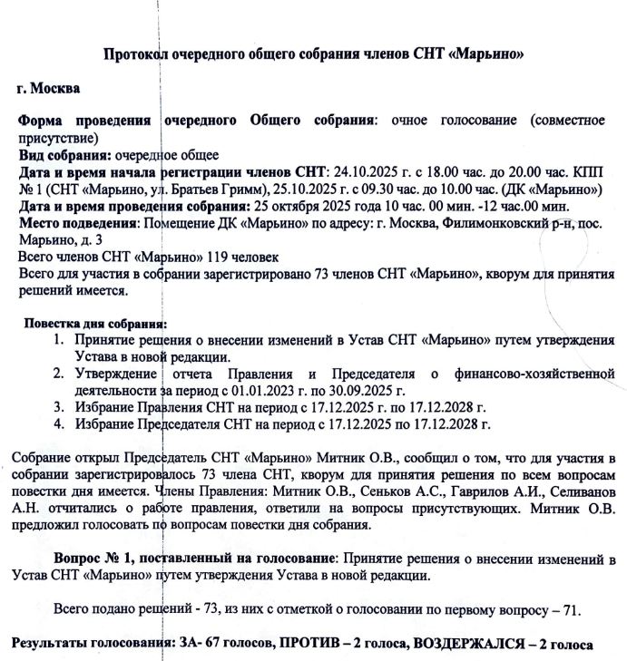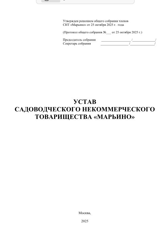 Документы к Очередному собранию членов СНТ Протокол ОС членов СНТ Марьино от 25.10.2025 Устав СНТ 2025 г. Отчет Правления СНТ фин деятельности Решение голосование на собрании. By admin|2025-10-25T16:34:00+03:0018 октября, 2025|Новости, Объявления|Нет комментариев Поделиться ссылкой, выберите способ! FacebookTwitterLinkedInRedditWhatsappTumblrPinterestVkEmail About the Author: admin Похожие записи Очередное собрание членов СНТ Gallery Очередное собрание членов СНТ Документы к Очередному общему собранию Gallery Документы к Очередному общему собранию Очередное общее собрание Gallery Очередное общее собрание Подведение итогов Очередного общего собрания. Gallery Подведение итогов Очередного общего собрания. Документы к Очередному общему собранию Gallery Документы к Очередному общему собранию Оставить комментарий Отменить ответВы должны быть авторизованы для комментирования.